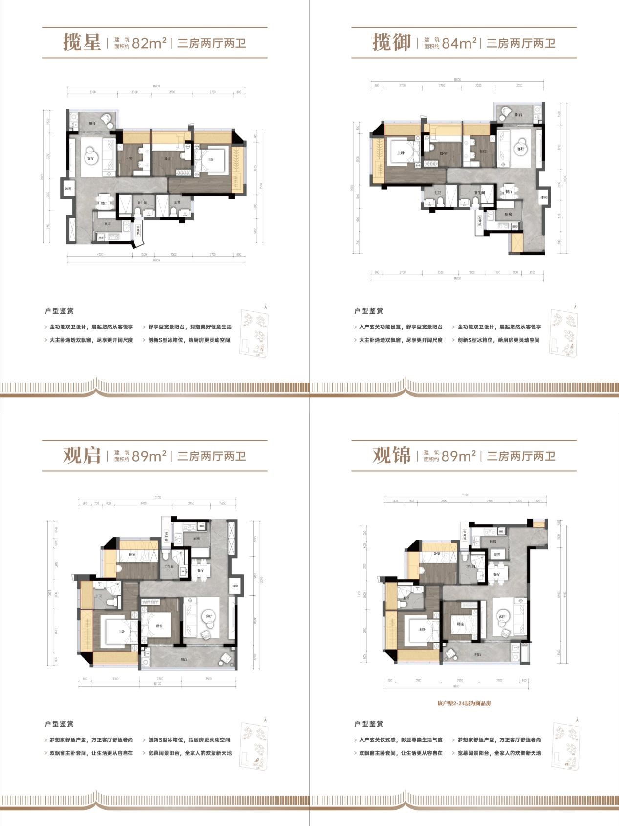 89平的“观启”和“观锦”户型则更加彰显尊崇生活的气度,超大的景观阳台可以打造成全家人的欢聚小天地;同时,梦想家的舒适户型,让客厅更加方正,空间利用率也极高。