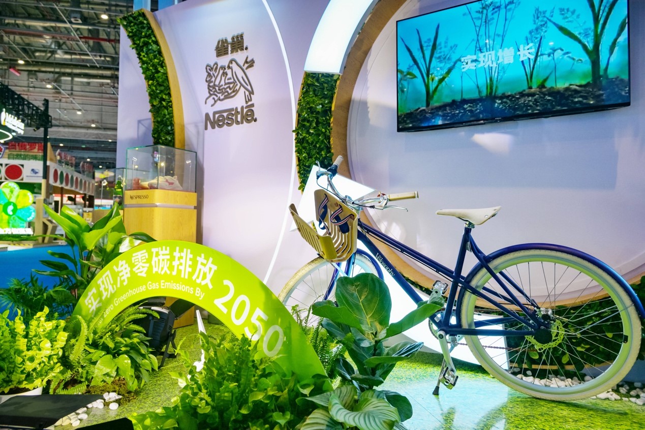 雀巢在第七届中国国际进口博览会(以下简称“进博会”)的展台被绿色所包围——不仅仅是展台四处印入眼帘的绿色植被,还有雀巢所展示出来的绿色可持续发展成果。譬如展台上用咖啡胶囊再生材料制作的自行车和运动鞋等展品,生动地向消费者呈现了可持续发展的生活方式;展区内的“净零碳排放路线图”也详细呈现了雀巢的可持续发展战略与路径。