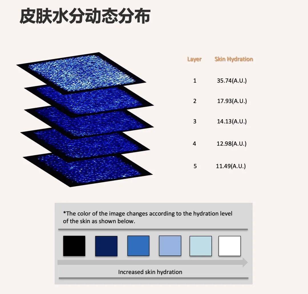 保湿功效评估:科丝美诗开发了深层保湿测试方法,通过仪器测量皮肤不同层次的水分含量,评估产品深层锁水效果。该方法采用分层水分含量成像,颜色越浅表明水分越高,便于产品功效直观呈现。