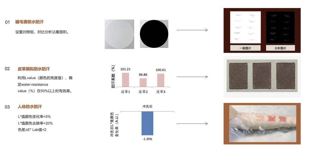 彩妆防水防汗测试:科丝美诗的彩妆评价平台运用模拟皮革和人体实验,测试睫毛膏等彩妆产品的防水防汗性能,确保彩妆在日常环境中的持色效果。
