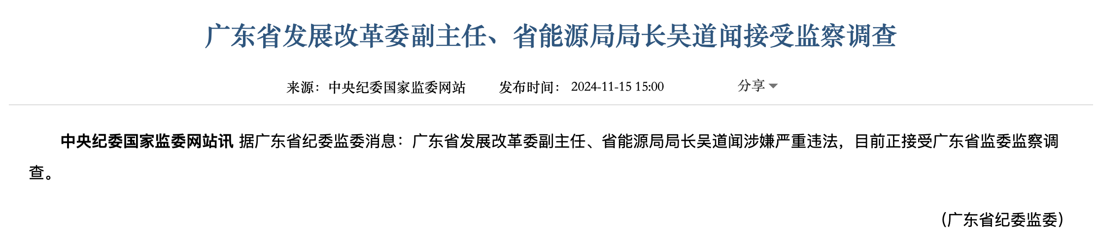 据中央纪委国家监委网站11月15日消息,广东省发展改革委副主任、省能源局局长吴道闻涉嫌严重违法,目前正接受广东省监委监察调查。