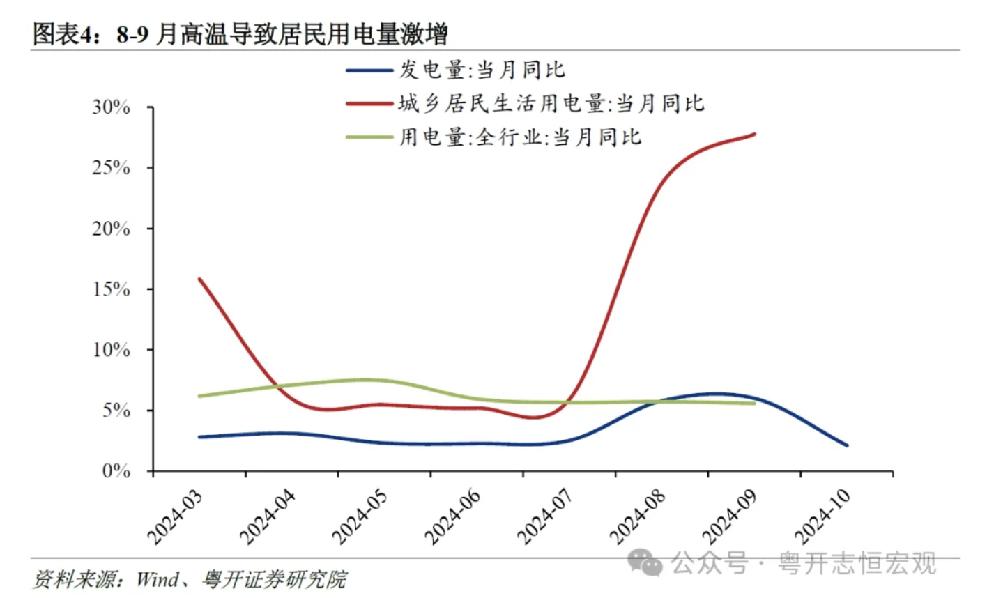 第一,工业生产持续恢复,同比回落主因居民用电的暂时性扰动。工业包括采矿业、制造业和公用事业(电力、热力、燃气及水生产和供应业)。10月采矿业和制造业景气度进一步提高,增加值同比分别由3.7%和5.2%升至4.6%和5.4%,也与制造业PMI由49.8%升至50.1%相一致。工业增加值同比回落,主要源于居民用电需求波动导致的发电量同比走低。今年八九月份,我国平均气温均为1961年以来历史同期最高,西南、华东、华中区域气温明显高于去年同期,居民用电量激增,同比增速由7月的5.9%大幅升至8-9月的23.7%和27.8%,相较之下,7-9月生产用电同比基本稳定在5.6%左右。随着天气转凉,居民用电需求回落,10月发电量同比由6%降至2.1%,电力、热力生产和供应业增加值同比由10.2%降至5.5%。