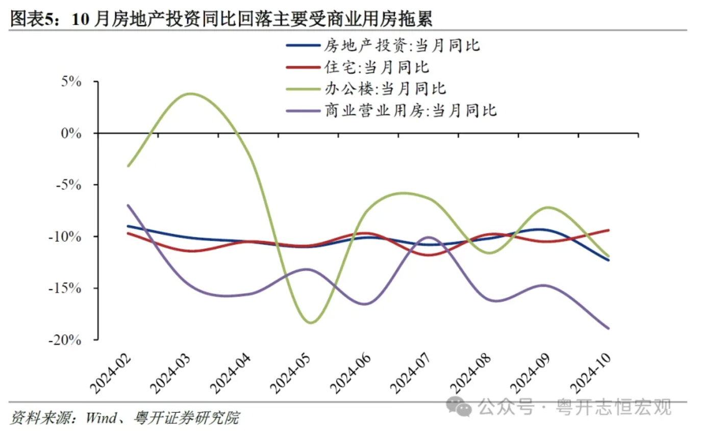 第二,房地产投资同比回落主要受商业用房拖累,商品住宅开发投资与销售回暖走势一致。房地产投资包括商品住宅、商业用房和其他用房的开发投资。10月房地产投资当月同比由-9.4%降至-12.3%,似乎与房地产市场回暖的形势不符,但实际上,商品住宅开发投资完成额当月同比由-10.5%升至-9.4%,与市场预期一致。商业用房市场仍较低迷,拖累房地产投资,10月办公楼、商业营业用房开发投资完成额当月同比分别由-7.2%和-14.8%降至-11.9%和-18.9%。据第一太平戴维斯统计,三季度北京、上海、广州、深圳的甲级写字楼空置率分别为19.4%、21.8%、18.1%和29.9%,处于历史高位,平均租金环比分别下降6.3%、4.3%、0.7%和2.1%。