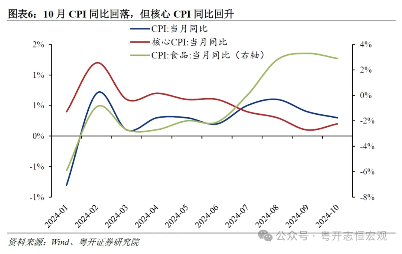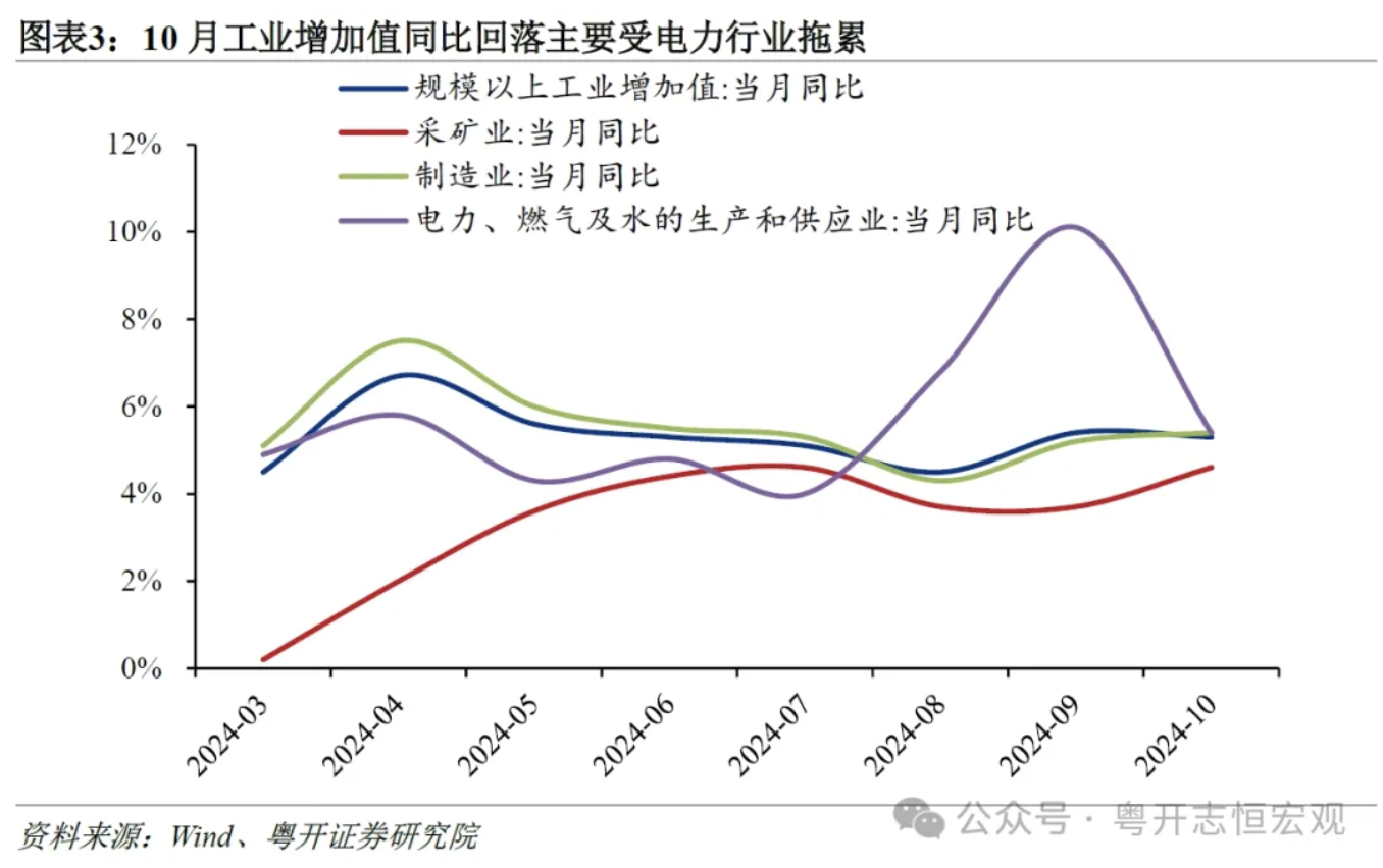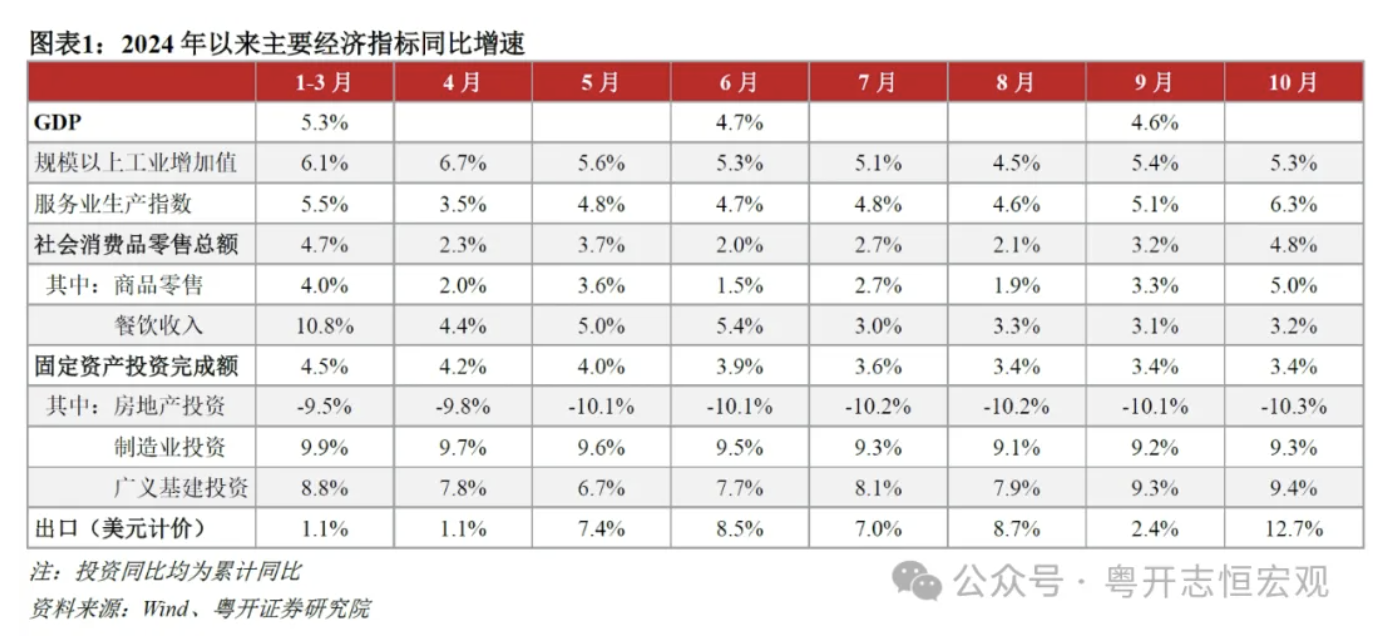 总体上看,随着一揽子增量政策逐步落地和“两重”“两新”政策的生效,10月经济在9月筑底回稳的基础上,加快恢复,确认了8月是全年经济的底部、9月是筑底企稳的起点。10月规模以上工业增加值和服务业生产指数同比分别为5.3%和6.3%,四季度GDP同比或能达到5%以上,助力全年“5%左右”增速目标的实现。