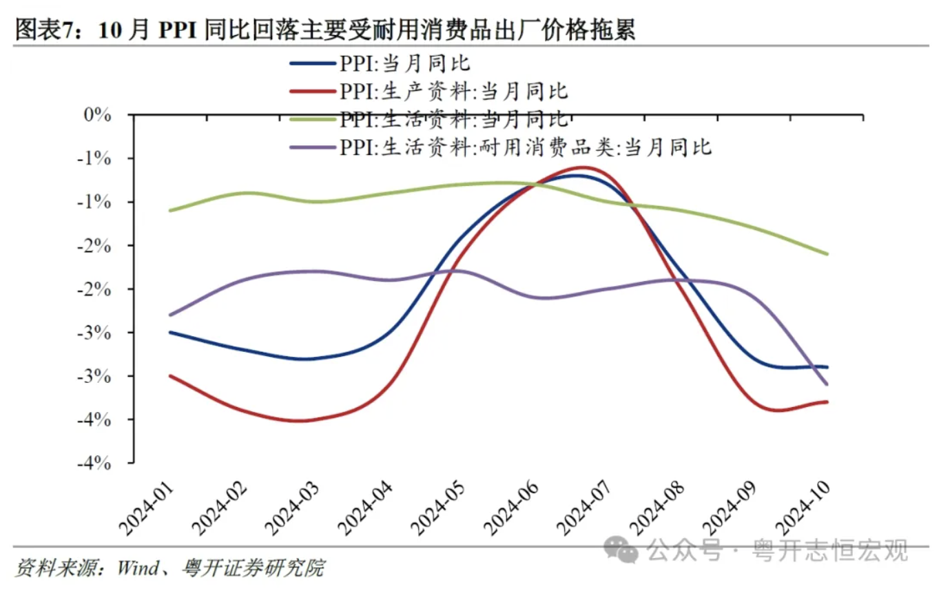 第三,CPI和PPI同比回落主要受食品和能源价格波动、企业降价促销等影响,未来有望温和回升。10月CPI同比小幅回落0.1个百分点,一是极端天气对鲜菜等食品的供给冲击消退,食品价格同比由3.3%回落至2.9%;二是能源价格下降,交通工具用燃料价格同比由-7.6%降至-10.5%。10月核心CPI同比由0.1%回升至0.2%,反映了居民消费出现回暖势头。10月PPI同比回落0.1个百分点,一是受国际原油价格波动下行对我国的输入性影响,石油和天然气开采业,石油、煤炭及其他燃料加工业价格同比降幅均较上月扩大4.5个百分点;二是国内部分行业竞争加大,企业降价促销,例如耐用消费品出厂价格同比由-2.1%降至-3.1%。10月钢铁、水泥价格出现止跌回升,黑色金属冶炼和压延加工业、非金属矿物制品业价格分别为连续4个月和3个月环比下降后首次上涨。随着一揽子增量政策加快推出,居民需求提振释放,CPI同比有望温和回升,PPI同比降幅也将逐步收窄。