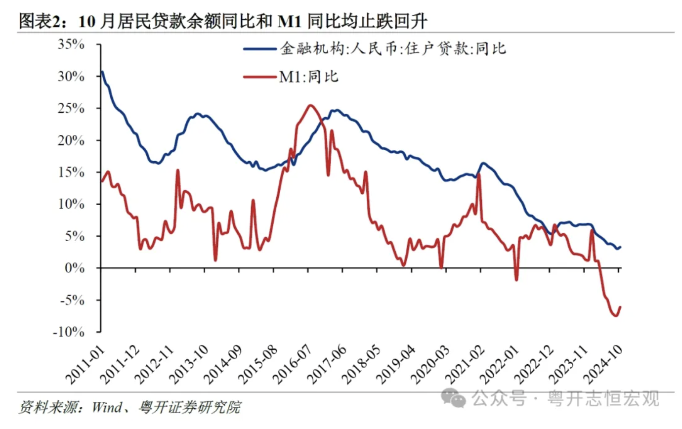 其六,居民部门重新加杠杆,M1同比止跌回升。10月新增居民贷款同比多增1946亿元,自2月以来首次由负转正;M1同比由-7.4%回升至-6.1%,自1月以来首次回升。居民消费和购房意愿提高,同时存量房贷利率下降减少了提前还贷现象,居民部门从降杠杆转向加杠杆;与此同时,居民消费和购房回暖,资金流入企业活期存款账户,带动M1同比降幅收窄,经济活跃度明显提高。