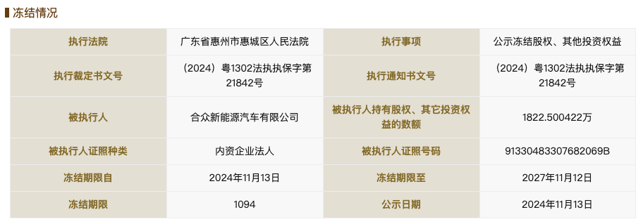 国家企业信用信息公示系统网站显示,11月13日,哪吒汽车关联公司合众新能源汽车股份有限公司新增一则股权冻结信息,股权被执行的企业为众联天下汽车销售服务有限公司,冻结股权数额1822万余元人民币,冻结期限自2024年11月13日至2027年11月12日,执行法院为广东省惠州市惠城区人民法院。