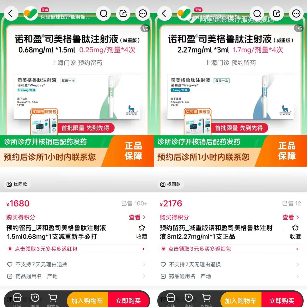 目前,在电商平台上,若是在天猫搜索“诺和盈”,可得到相关预约留药服务信息。例如,由阿里健康医疗服务旗舰店提供的“诺和盈司美格鲁肽注射液1.5ml0.68mg*1支减重新手必打”、“诺和盈司美格鲁肽注射液3ml2.27mg*1支正品”,前述预约留药的价格分别为1680元、2176元(如下图)。
