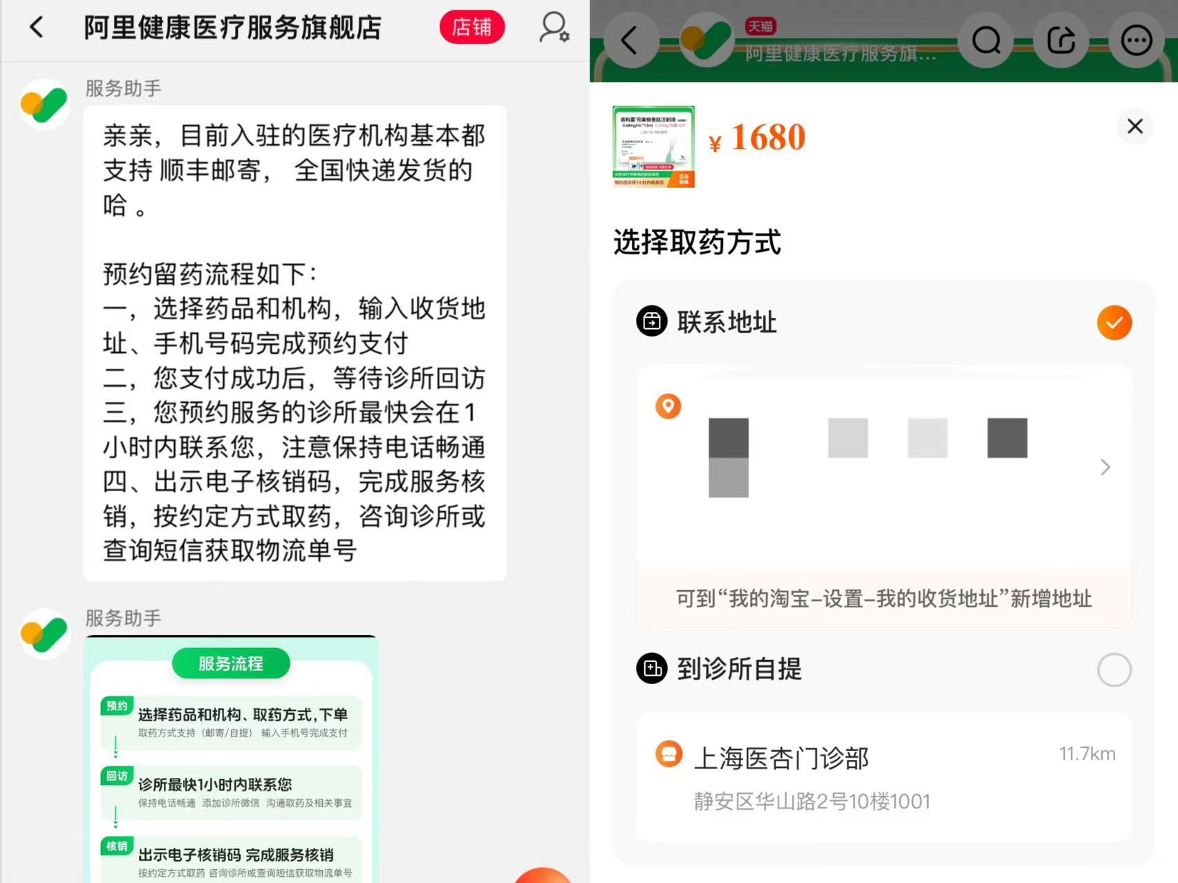 据服务助手提示,目前入驻的机构基本支持顺丰邮寄、全国快递发货。同时,这一产品也支持诊所自提,例如位于上海市静安区华山路的上海医杏门诊部。