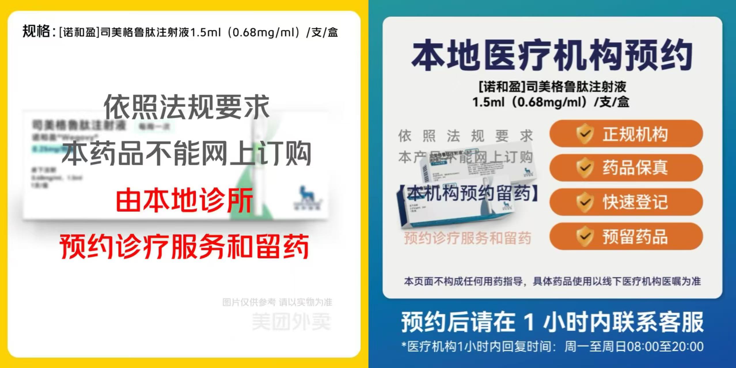 同时,美团的合作方也包括上海医杏门诊(美团显示为“上海毓舫医杏门诊”)。美团、饿了么同时提示,依照法规要求,本药品不能网上订购,由本地诊所预约诊疗服务和留药。