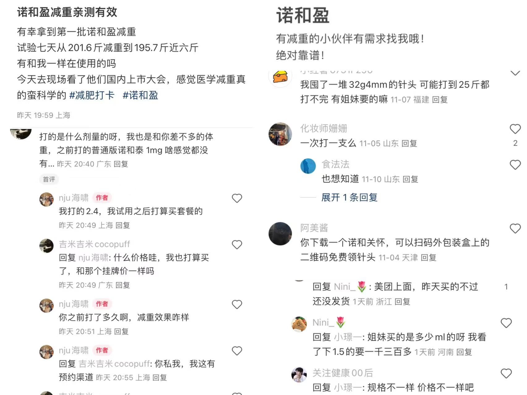 另在小红书上,关于“有幸拿到第一批诺和盈减重”、“私信获得预约渠道”、“1396买了,直接邮寄、没有问诊” 、“下载诺和关怀,扫二维码免费获得针头”的讨论也已出现。