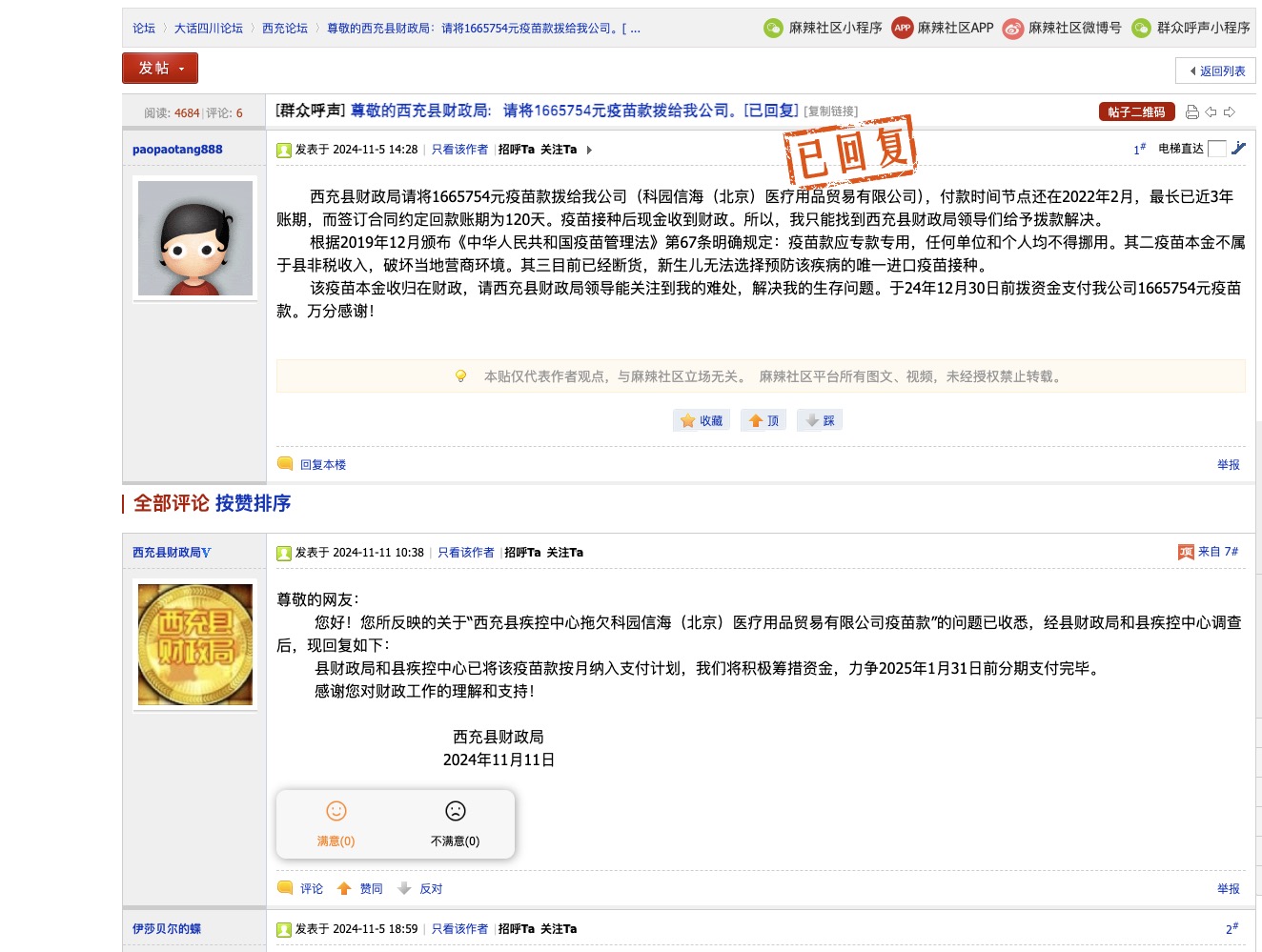 此前,11月5日,在四川省网上群众工作平台,科园贸易相关工作人员给西充县财政局写了一封催款贴,请求对方拨付已被拖欠近3年的166万元疫苗款。对此,西充县财政局回帖表示,县财政局和县疾控中心已将该疫苗款按月纳入支付计划,将积极筹措资金,力争2025年1月31日前分期支付完毕。