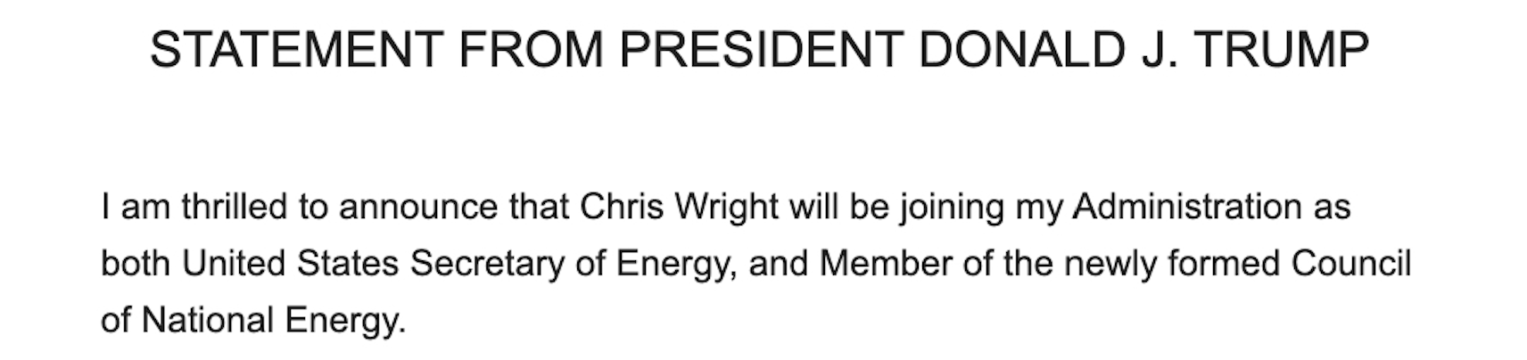 特朗普表示,除了领导能源部外,赖特还将成为他新成立的国家能源委员会的成员。