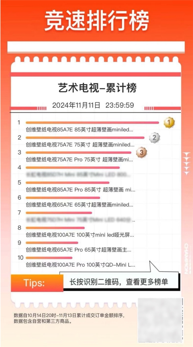 随着双十一购物节的圆满落幕,创维壁纸电视以其卓越的品牌实力、技术创新和市场表现,再次成为消费者关注的焦点。综合各大电商平台数据,创维壁纸电视销量同比增长100%,延续往年促销的强势表现!其中,据京东双十一竞速排行榜显示,双十一期间艺术电视累计榜前十名中,创维壁纸电视占据八席,并牢牢霸占前三,持续稳占艺术电视品类第一。在这个年度大促中,创维壁纸电视依然是电视行业的最强增长引擎。