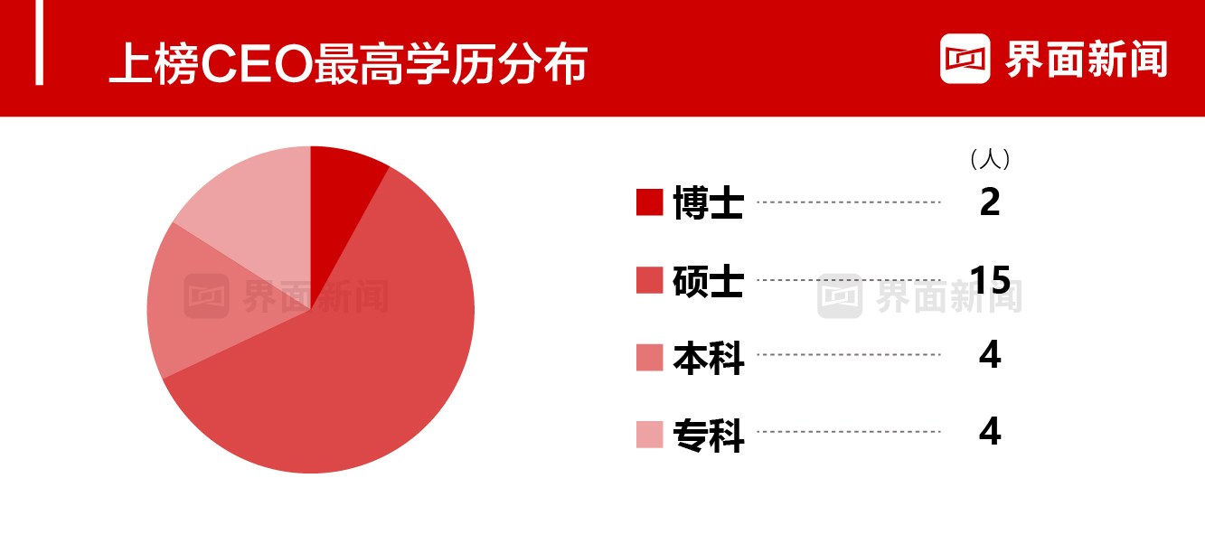 工业领域作为知识密集型与技术密集型产业,高程度依赖技术革新与制造业发展水平。对企业而言,高管的学历背景也备受关注。25位上榜CEO中,最高学历为硕士及以上的有17人,占比达到64%,其中硕士15人,博士2人。