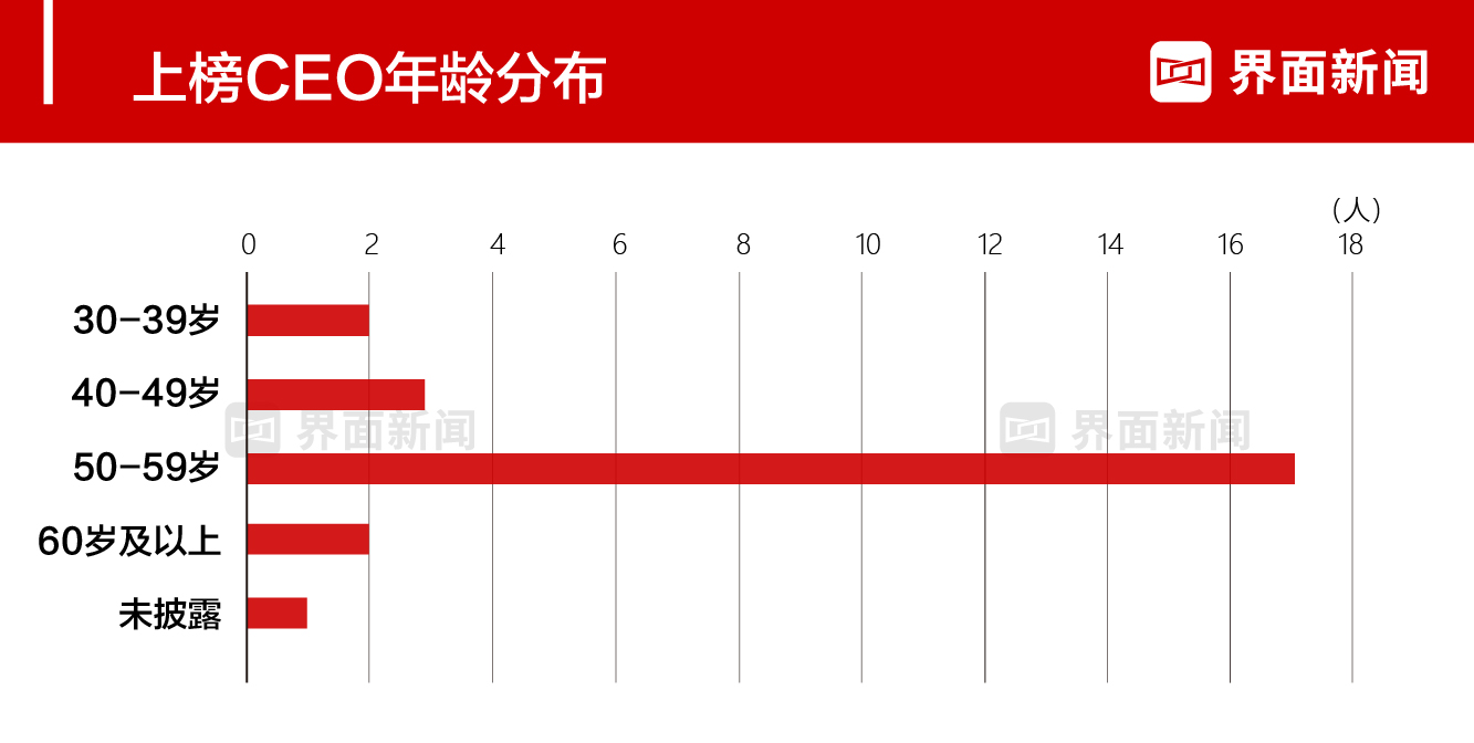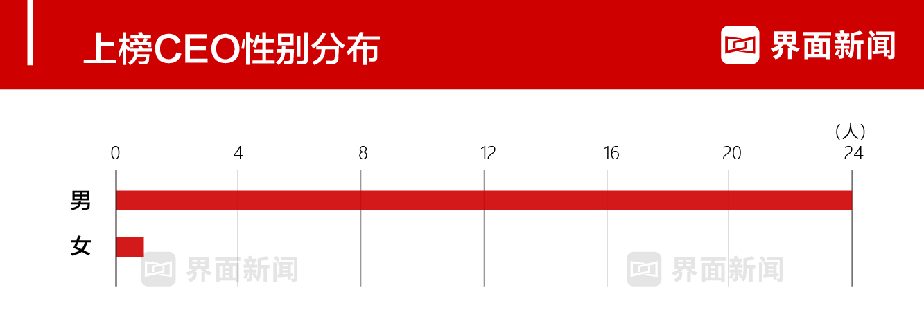 上榜的25位CEO中,1人未披露年龄,其他24位的平均年龄为53岁。其中,最年轻的当属海天国际的行政总裁张斌,今年38岁。榜单中唯一的女性为光启技术的总经理栾琳,今年45岁。
