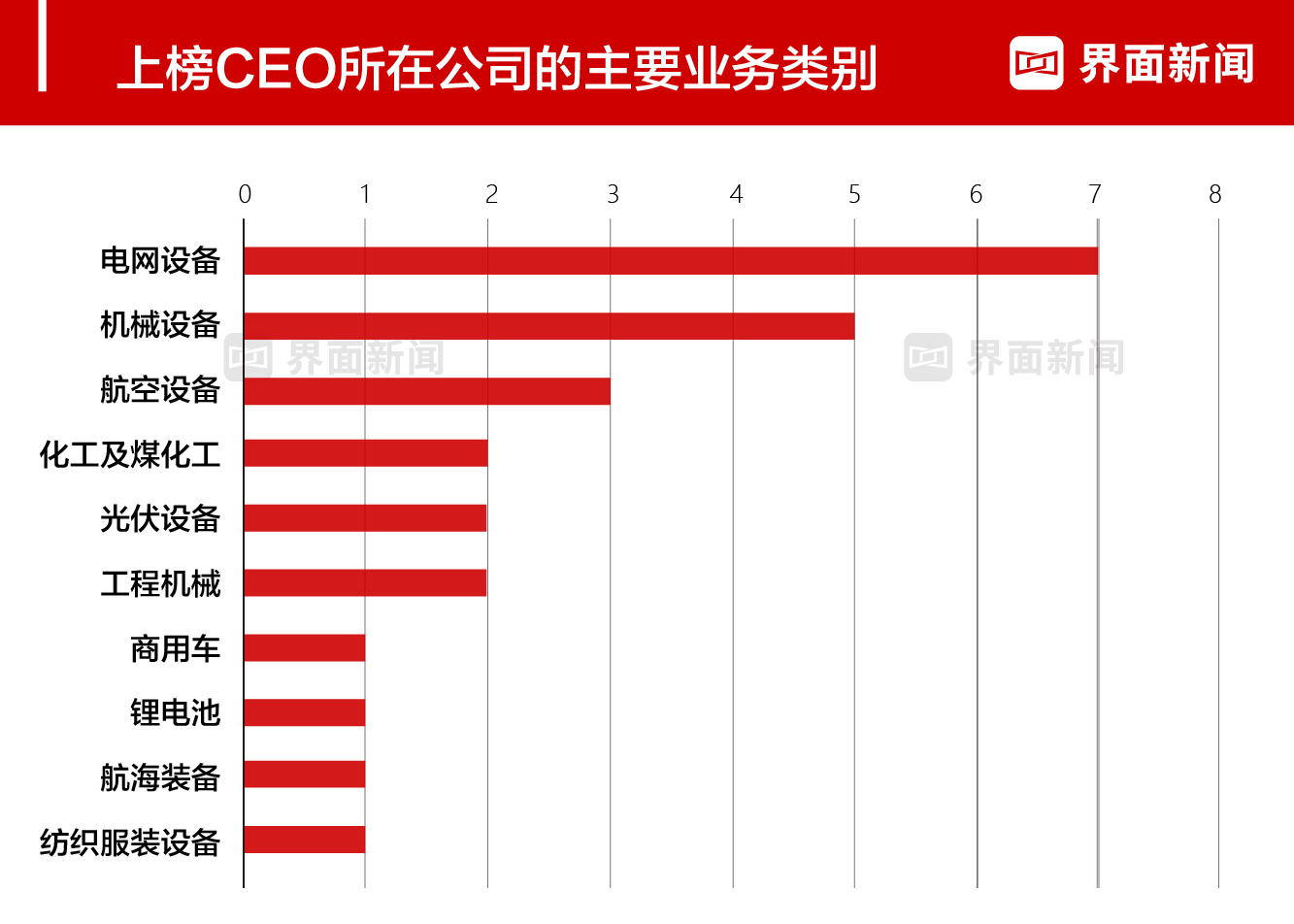 从上榜CEO所在公司的主营业务来看,以电网设备业务为主的公司最多,共有7家;主营机械设备业务的公司有5家,主营航空装备业务的公司有3家。