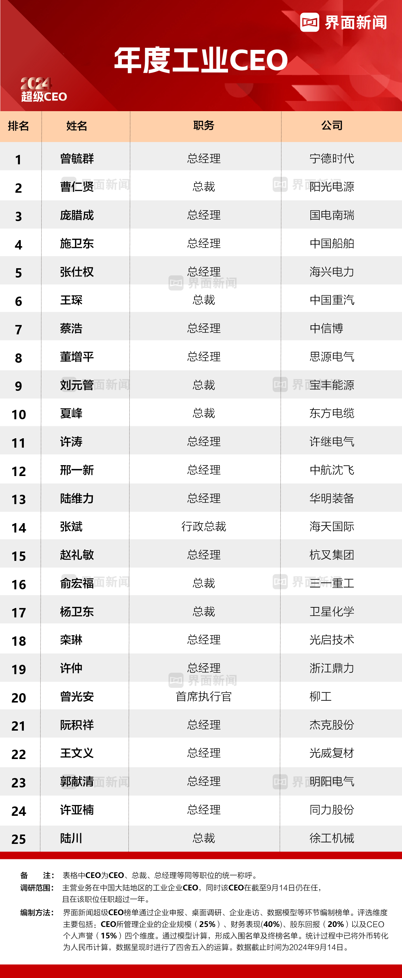 本篇中CEO为首席执行官、总裁、总经理等同等职位的统一称呼。我们的研究面向中国地区工业企业CEO。界面新闻超级CEO榜单通过企业申报、桌面调研、企业走访、数据模型等环节编制榜单。评选维度主要包括:企业规模(25%)、财务表现(40%)、股东回报(20%)、个人声誉(15%)四个维度。通过模型估算,形成入围名单及终榜名单。统计过程中已将外币转化为人民币计算,数据呈现时进行了四舍五入的运算。