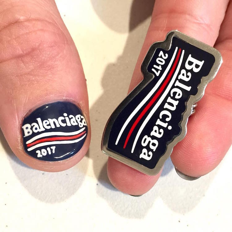 还有像Balenciaga,在其2017秋冬男装系列发布会上,甚至给男模们也做了印着品牌这一季根据曾和希拉里竞争民主党候选人的Bernie Sanders(伯纳德•桑德斯)的竞选图案而生的新Logo样式的美甲。