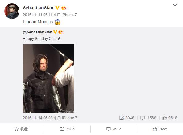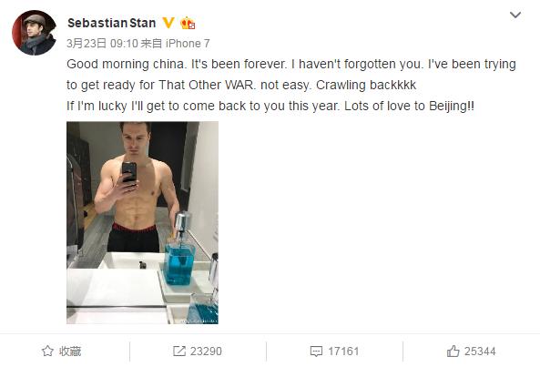 3月23日,“冬兵”饰演者塞巴斯蒂安·斯坦发微博向中国观众问好,热情地表示自己没有忘记中国的朋友们,并暗示如果一切顺利,或将与漫威电影《雷神3》的主创团队一起来京宣传。