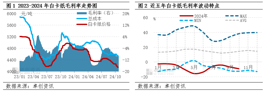 “近两年,白卡纸生产成本与价格均呈现震荡下滑趋势,但纸价整体低于成本线以下运行,市场理论盈利较弱。”卓创资讯分析师孔祥芬分析称,现有规模企业多配有自制浆产线,实际毛利情况要好于数据呈现,但市场整体盈利下滑的趋势较为一致。
