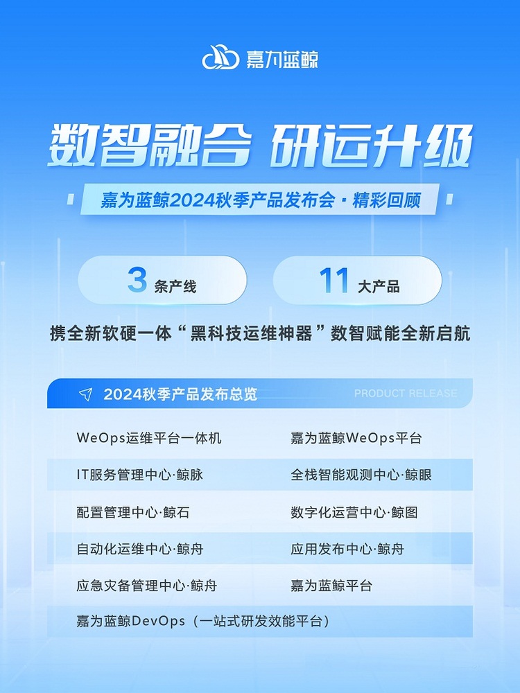 近日,嘉为蓝鲸秋季产品发布圆满结束,向业界展示了其在研运领域的最新研发成果。作为一家始终保持对市场需求敏锐嗅觉,紧跟技术发展前沿,并坚定投身于产品研发与迭代升级的公司,嘉为蓝鲸此次发布涵盖了其三大核心产品线——WeOps、AIOps、DevOps下的11款新产品,分别是:WeOps运维平台一体机、WeOps平台V4.15 LTS、IT服务管理中心V4.0、全栈智能观测中心V4.2、配置管理中心V6.0、数字化运营中心、自动化运维中心V2.3、应用发布中心V5.7、应急灾备管理中心V1.3、嘉为蓝鲸平台V5.3、嘉为蓝鲸DevOps V7.0一站式研发效能平台。