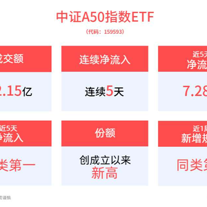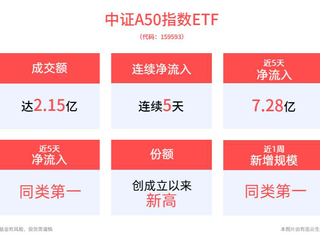 从资金净流入方面来看,中证A50指数ETF近5天获得连续资金净流入,最高单日获得3.27亿元净流入,合计“吸金”7.28亿元,日均净流入达1.46亿元。
