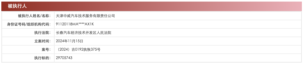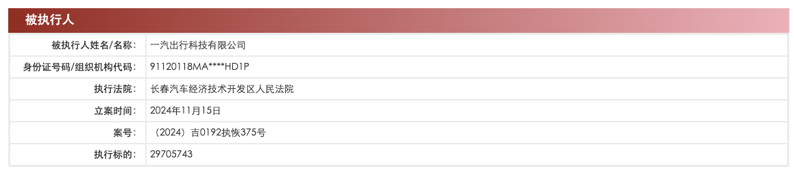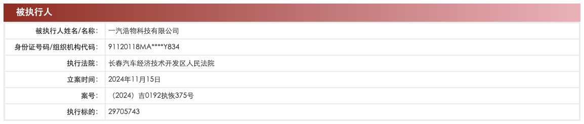 中国执行信息公开网显示,11月15日,一汽出行科技有限公司、一汽浩物科技有限公司、天津中威汽车技术服务有限责任公司新增一则恢复执行信息,执行标的2970万余元,执行法院为长春汽车经济技术开发区人民法院。