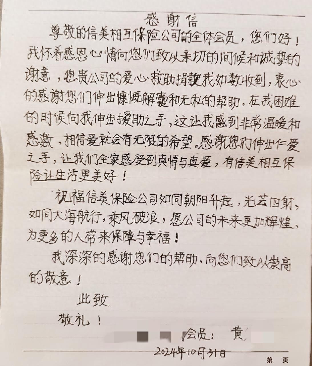 黄女士收到信美爱心救助款项后,专程给信美写了一封感谢信。“您贵公司的爱心救助捐款我如数收到,衷心的感谢您们伸出慷慨解囊和无私的帮助。在我困难的时候向我伸出援助之手,这让我感到非常温暖和感激,相信爱就会有无限的希望...愿公司的未来更加辉煌,为更多的人带来保障与幸福!”她在信中说道。