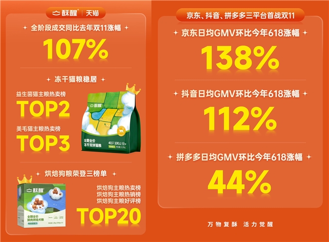 今年的双十一购物狂欢节已经落下帷幕,各大电商平台纷纷晒出战报。在宠物食品类目,国产猫粮品牌酥醒表现非常亮眼,各渠道成交额大幅上涨。根据官方数据,酥醒在天猫平台的销量激增,全阶段成交同比去年双十一涨幅107%,京东日均GMV环比今年618涨幅138%,抖音日均GMV环比今年618涨幅112%,拼多多日均GMV环比今年618涨幅44%。
