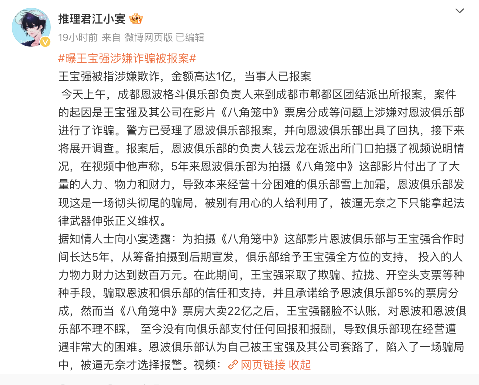 此前有自媒体博主发文,称成都恩波格斗俱乐部向警方报案,王宝强及其公司涉嫌诈骗,金额高达1亿,相关话题迅速登上微博热搜。该博主发布的报案回执简要信息显示:报警人所在公司与王宝强所在公司合作拍摄电影《八角笼中》,因票房分成问题,报警人报警称王宝强及其公司涉嫌诈骗。