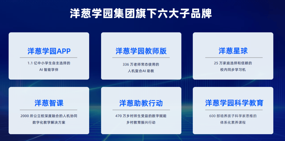 目前,洋葱学园旗下共有“洋葱学园APP”、“洋葱学园教师版”、“洋葱星球”、“洋葱学园科学教育”、“洋葱智课”和“洋葱助教行动”在内的六大品牌。其中,洋葱学园APP是面向中小学生的、人人可享的新一代 AI 智能学伴,培养学生面向未来的自我驱动、创新思维、从容自信、善于提问等多元化能力;洋葱智课,通过人机双师教学与人机精准教学模式,培养“人机复合型教师”,指引学生高阶思维养成与个性化学习等;洋葱学园科学教育,则侧重培养学生的科学家成长思维。