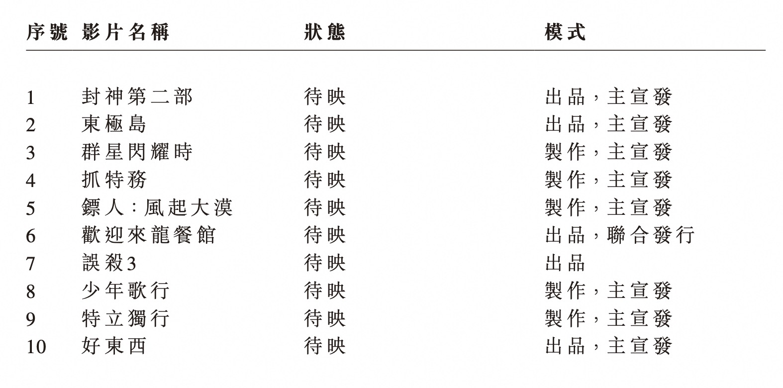目前,阿里影业储备影片数量充足,70部储备电影中,《封神第二部:战火西岐》、《东极岛》、《群星闪耀时》、《抓特务》、《镖人:风起大漠》、《欢迎来龙餐馆》、《误杀3》、《少年歌行》、《特立独行》等影片将根据市场情况陆续上映,其中阿里影业参与出品的《好东西》口碑爆棚,揽获同档期点映上座、场均人次双料第一,目前豆瓣开分9.1,于11月22日正式公映,灯塔专业版预测,总票房将超4亿。