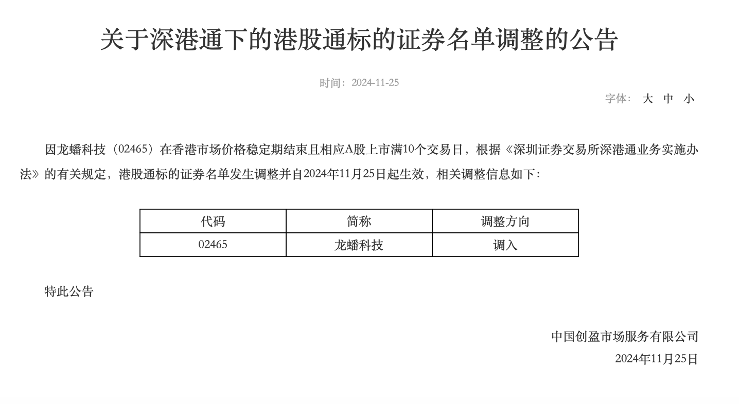 深交所11月25日公告,深港通下的港股通标的证券名单发生调整并自2024年11月25日起生效,调入龙蟠科技。