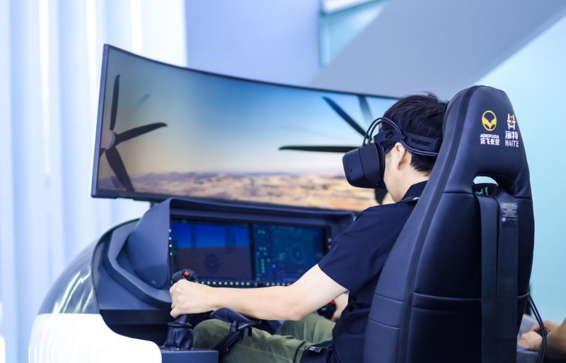 此次沃飞长空展出的全功能飞行模拟器(FFS),使用与高等级全动飞行模拟机相同的模拟仿真平台,结合AE200飞行器本体特性,操纵控制、飞行特点等真实数据与逻辑,配合6自由度运动平台及MR混合现实头显系统,以简易且直观的形式,给体验者提供AE200型电动垂直起降飞行器在未来的应用场景、操作方式等特性的沉浸式演示与体验。