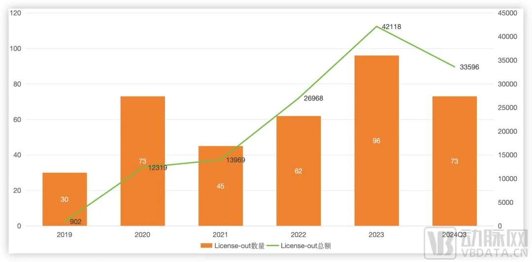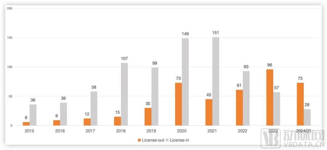 2015年~2024Q3,国内药企License-in/out项目数量,数据源自国盛证券