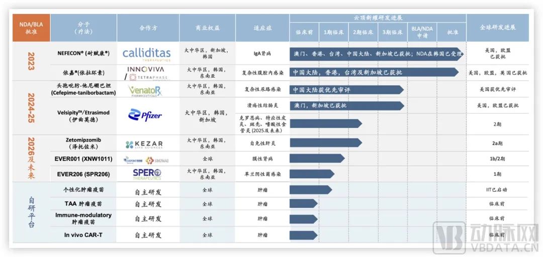 以云顶新耀为例,肾脏疾病、感染性疾病、自免和mRNA平台是其接下来主要布局的领域,并且按照商业化阶段进行了重要安排。