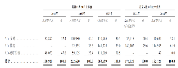 AI+城市治理业务应用场景主要包括园区管理、智慧校园管理、应急管理和社区管理,行业同样表现为竞争格局高度分散且区域多元化的特点。相比之下,该业务收入占比呈现波动下滑趋势,在2023年实现1.11亿元收入之后,2024年上半年仅取得4.7万元收入。诺比侃表示,主要是由于根据不同的项目实施及交付时间表,公司AI+城市治理项目的客户验收存在时间差异。