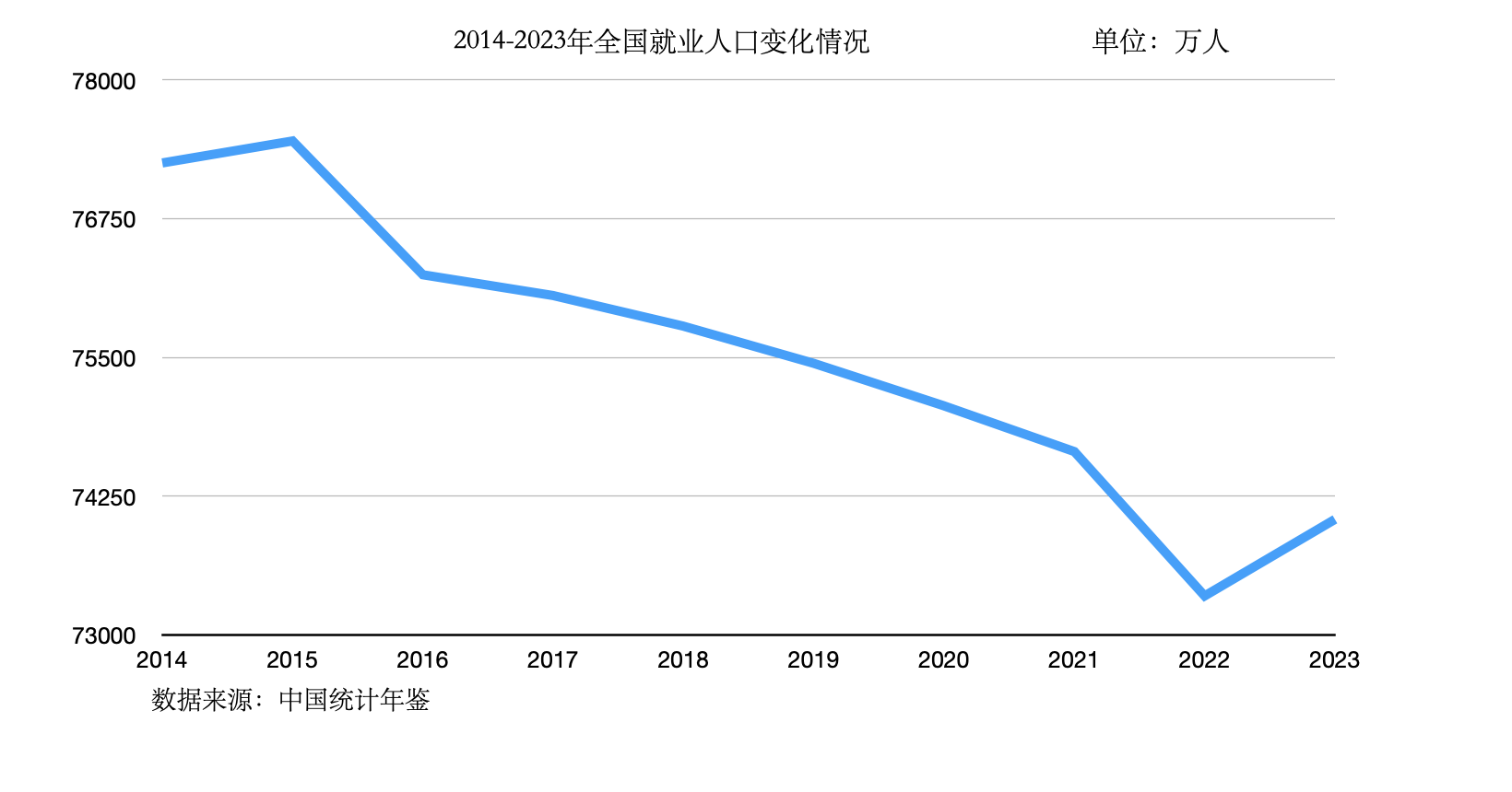 梳理近年来中国统计年鉴公布的数据可以发现,2015年,我国就业人口达到7.745亿人,之后逐年下降,但这一趋势在2023年被打断。