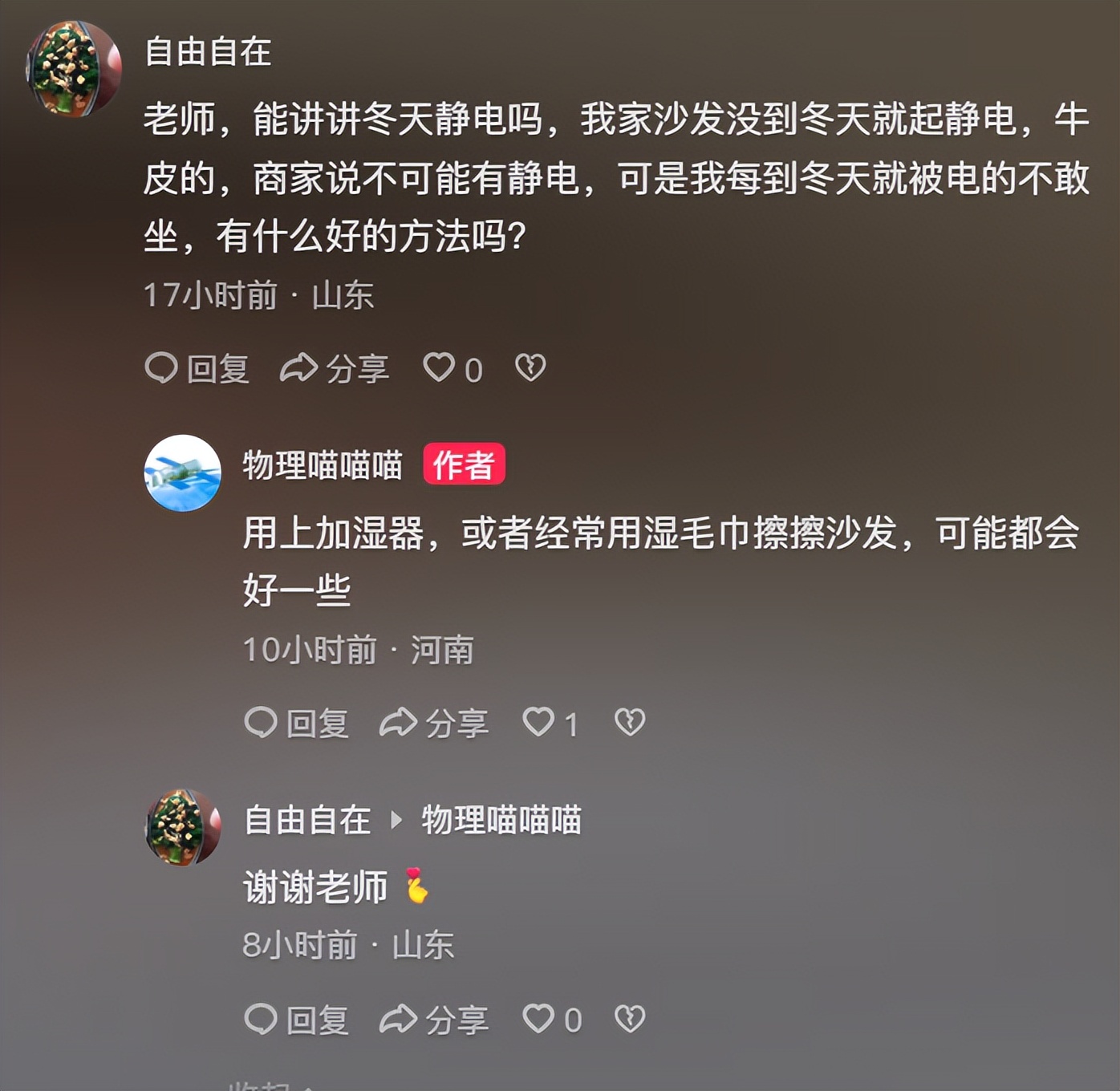 除了学生和教师同行来切磋交流,评论区中也不乏好学的“生活家”们。“老师,能讲讲冬天静电吗,我家沙发没到冬天就起静电,牛皮的,商家说不可能有静电,可是我每到冬天就被电的不敢坐,有什么好的方法吗?”这就是出现在刘宝菊静电实验小视频评论区的一条留言。用通俗易懂的物理知识提供生活居家小窍门,真正做到“科技服务生活”。(大河报·豫视频记者 周斌)
