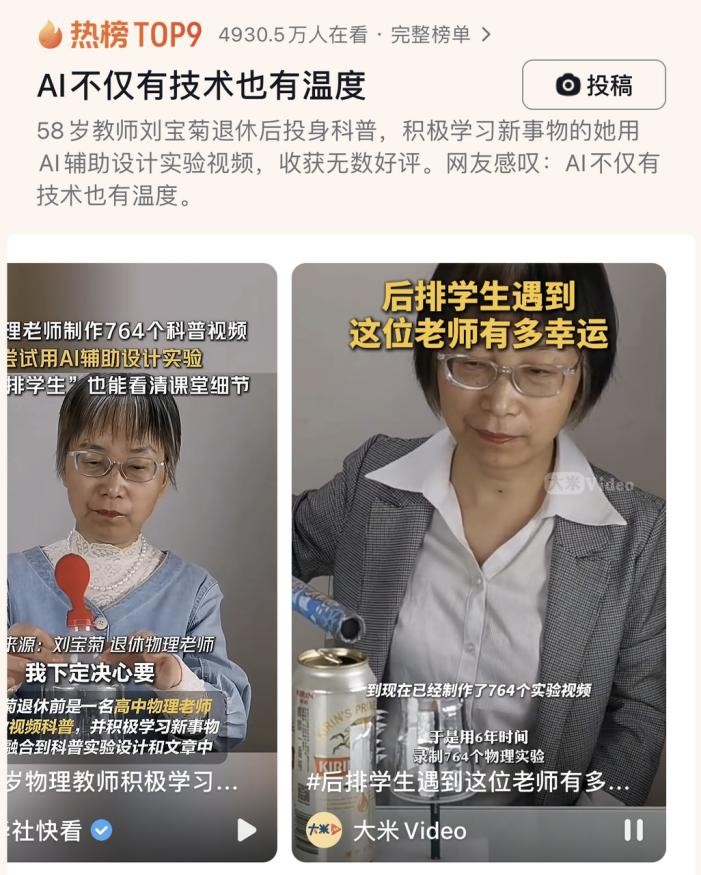 三年前,她退休了。和其他同事不同,刘宝菊并没有选择回归家庭、安享晚年,而是乘着AI浪潮,开启了自己教育事业的“第二春”——在抖音上做物理实验,还收获了全网6万多“云学生”。