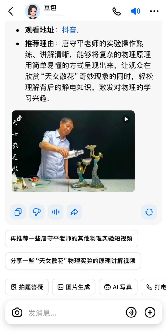 “豆包是我得力的实验助手”。拍摄实验视频的过程中,刘宝菊偶然接触到了豆包AI。起初,她只是尝试用其搜索资料,寻找实验设计灵感。但随着使用的深入,她渐渐发现,豆包能够较均衡地兼顾实验的安全性、可操作性和试验效果,为她列出具体的实验设计参考,替她考虑到容易忽略的实验细节,大大提高了备课效率。