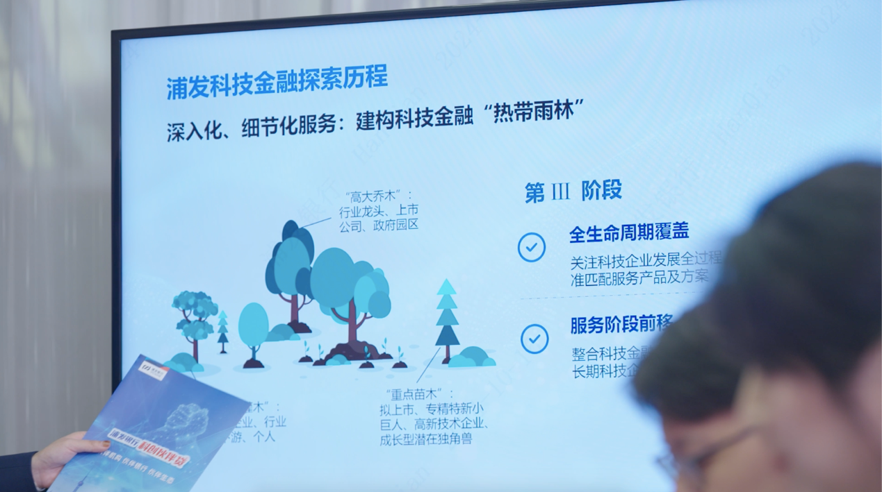 科技创新离不开金融创新。浦发银行先行先试,首创“热带雨林”式全生命周期科创企业服务模式,针对三大类企业:“高大乔木”,包括行业龙头、上市公司、政府园区;“重点苗木”,包括拟上市、专精特新小巨人、高新技术企业、成长型潜在独角兽;“茂密灌木”:包括小微企业、行业上下游、个人,分层提供覆盖企业全生命周期的信用贷款产品体系。