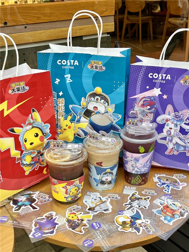 除了在饮品创新研发上下足功夫,COSTA COFFEE还为粉丝及玩家准备了丰厚的福利惊喜:活动期间,除了购买联名饮品有机会获得联名纸袋和杯套以外,凡是到线下门店正价购买任意一款《宝可梦大集结》联名饮品的消费者,均可获得宝可梦大集结周边,包括经典角色贴纸和亚克力立牌。这样的活动机制,也成为了粉丝及玩家打卡购买的重要因素。