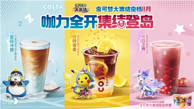 本次联名,COSTA COFFEE从宝可梦IP中的三大经典角色——皮卡丘、卡比兽、仙子伊布中汲取灵感,不仅捕捉到了这三只宝可梦各自鲜明的招式特征,更巧妙地将这些角色的标志性元素融入设计,推出了三款限量版创意饮品:滋滋柠檬气泡美式、竹香斑斓风味生椰拿铁及葡萄果香轻乌龙。