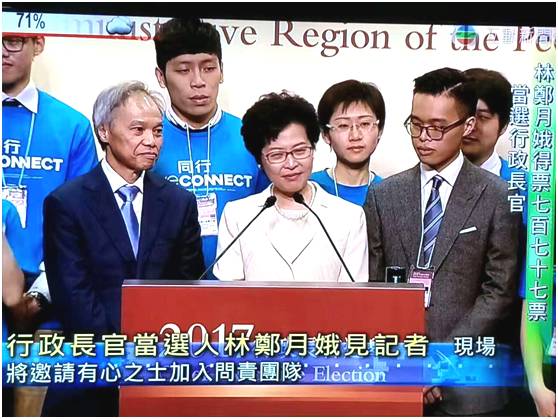 香港特别行政区第五任行政长官选举结果3月26日揭晓。出身基层的林郑月娥以777票在行政长官选举中胜出,成为特区首位女特首人选。当选人林郑月娥将于今年7月1日正式宣誓就职。