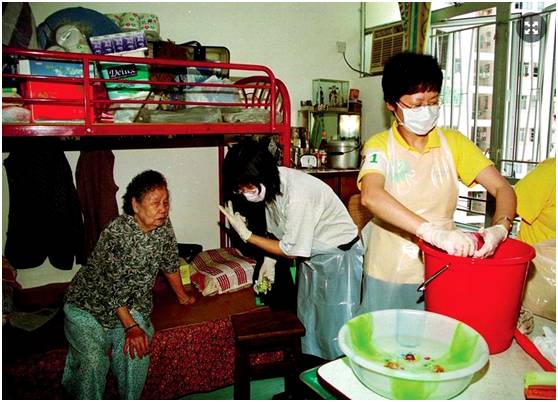 2003年SARS,时任社署署长的林郑月娥响应清洁号召,到社区探访老人,并帮助老人打扫房间。