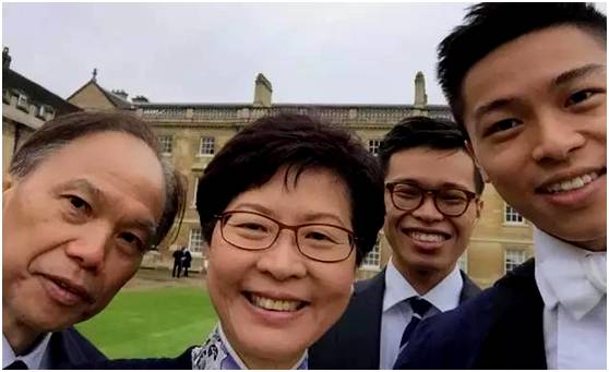 (林郑月娥与家中“三个男人”,图为一家人参加二儿子林约希(右一)剑桥大学三一书院毕业礼时合影)
