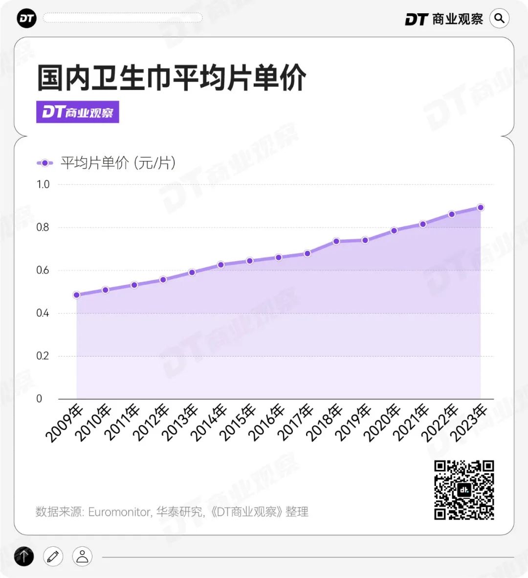 根据 Euromonitor数据,从2009年至2023年,卫生巾平均价格从0.49元/片增长到0.9元/片,以4.79%的年复合增长率持续上涨。