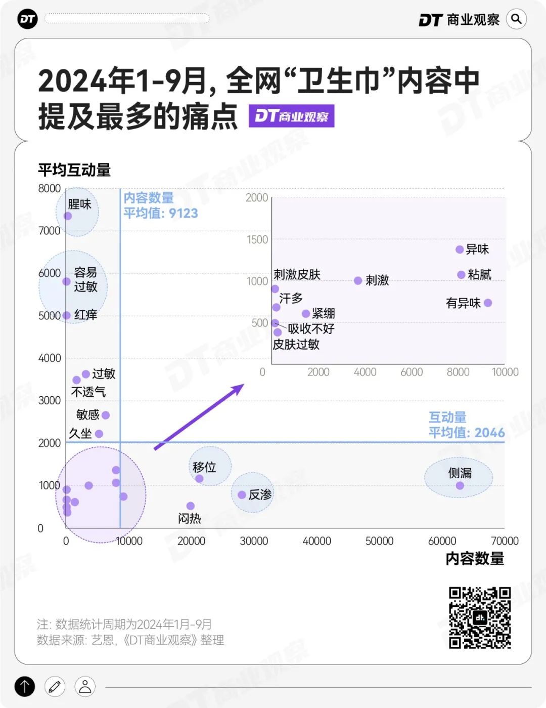 参考艺恩营销智库的数据统计,在今年1-9月,全网关于“卫生巾”的讨论中,侧漏、反渗、移位、闷热等问题被频繁提及。